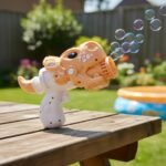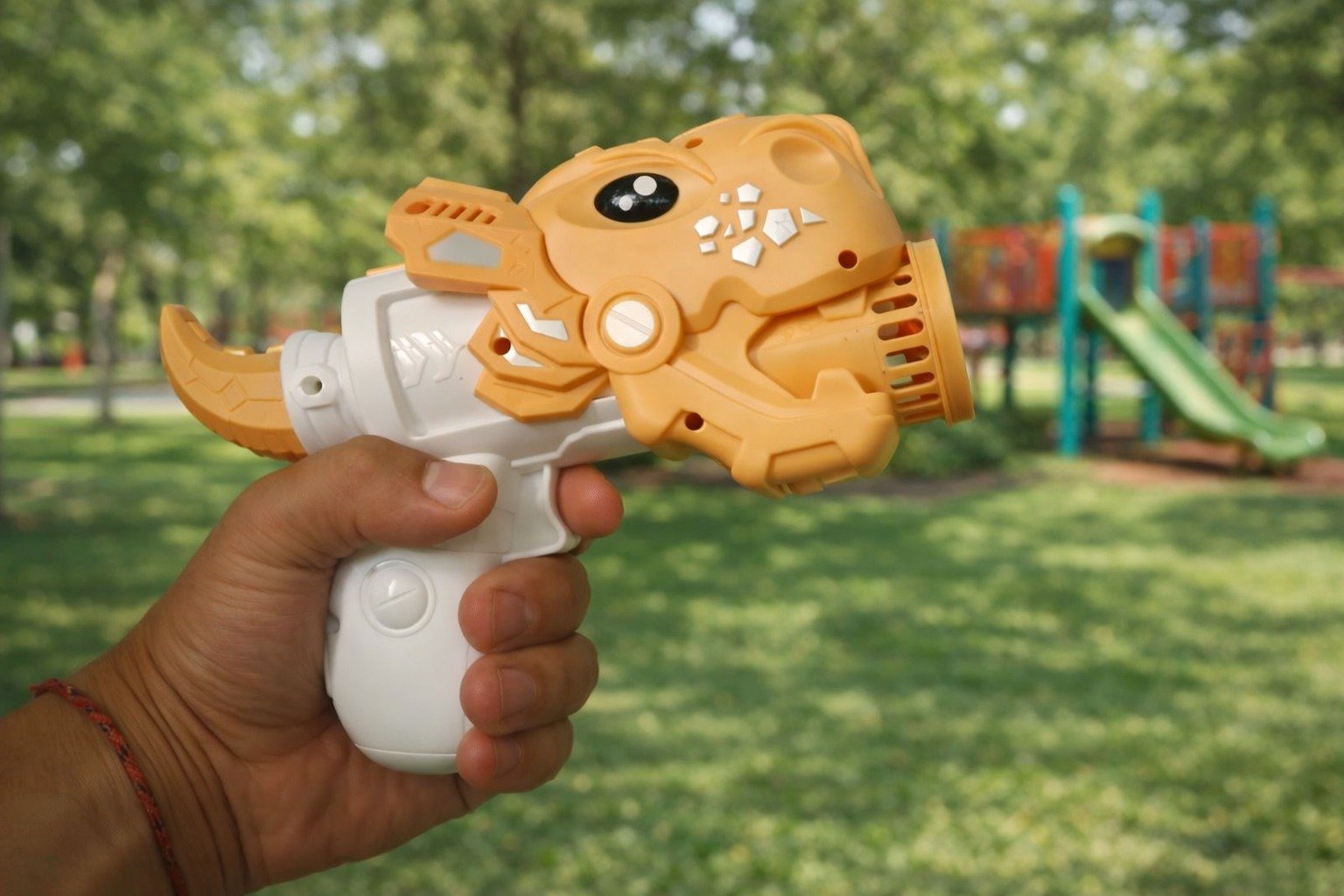 El diseño es cómodo de sostener y fácil de usar. Funciona con 2 pilas AA (no incluidas). Sus medidas aproximadas son 23 x 16 cm, lo que lo hace práctico para transportar y manipular. Perfecto para parques, patios, cumpleaños y actividades recreativas.