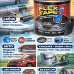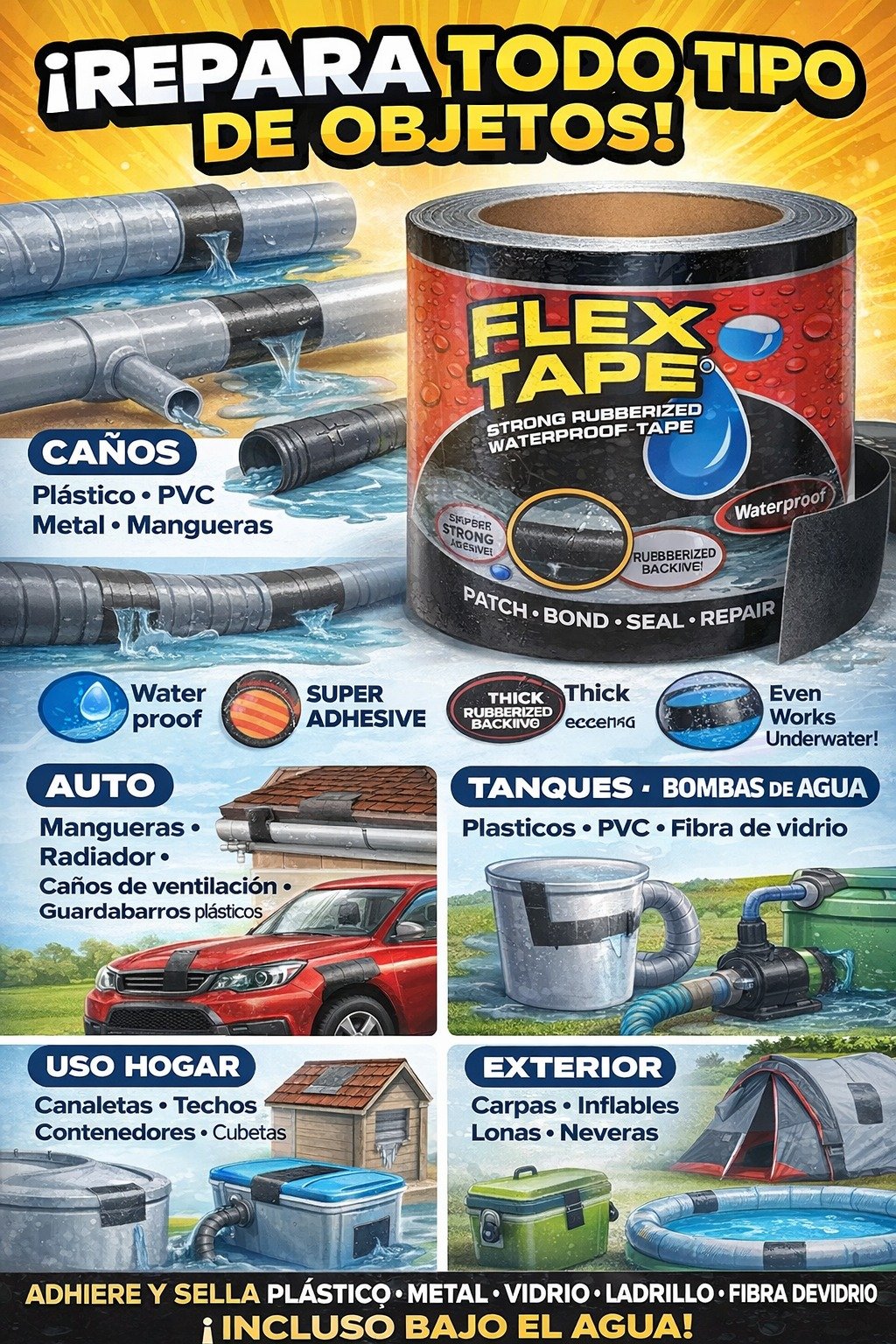 Cinta reparadora impermeable rubberizada tipo Flex, diseñada para sellar, pegar y reparar de forma rápida y práctica una amplia variedad de superficies. Cuenta con un respaldo de goma gruesa y un adhesivo de alta adherencia que permite crear un sellado resistente al agua, incluso en zonas con humedad o bajo el agua.