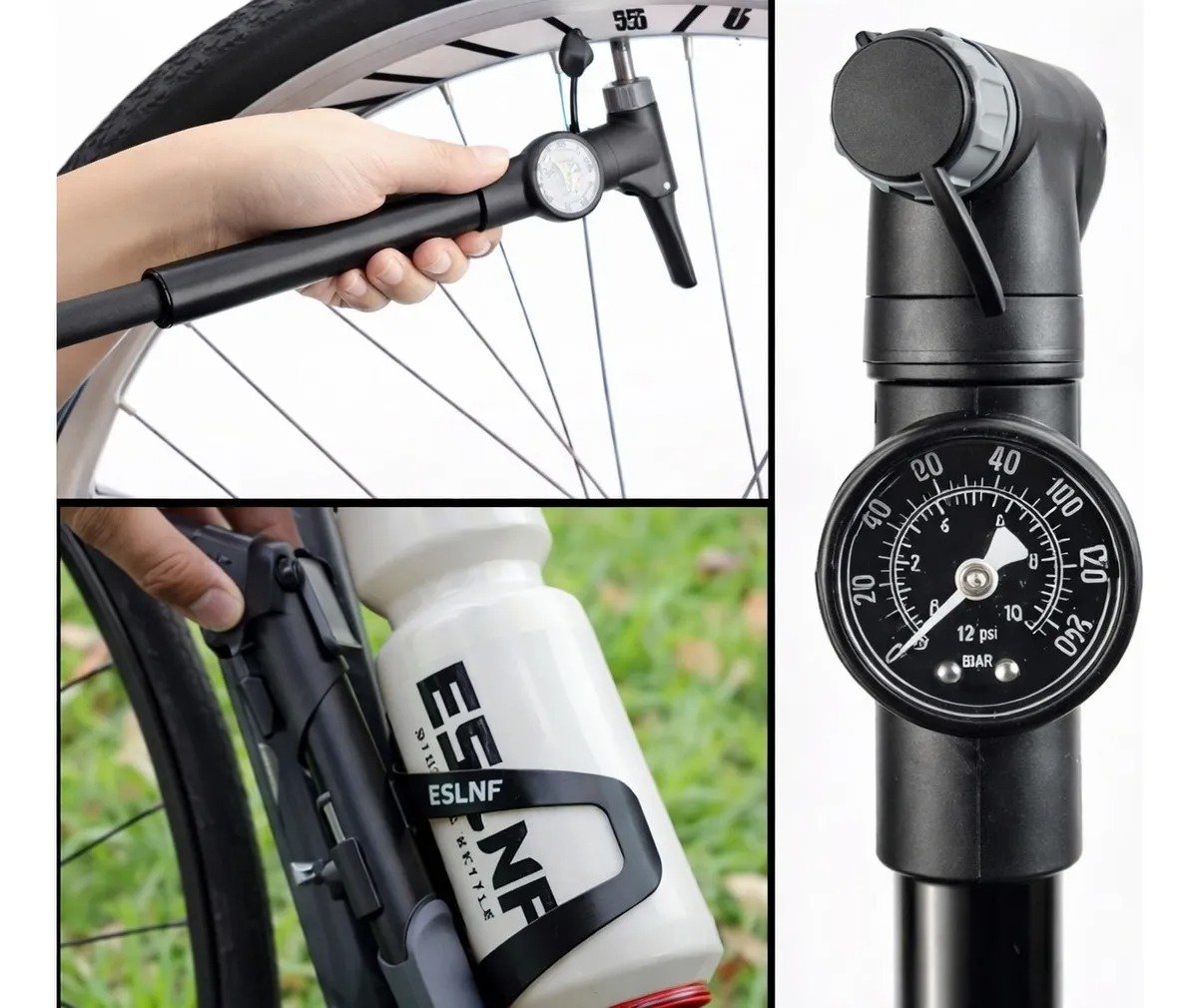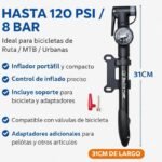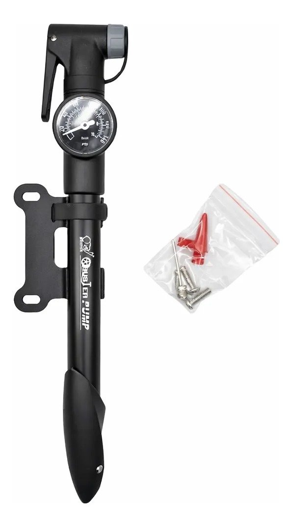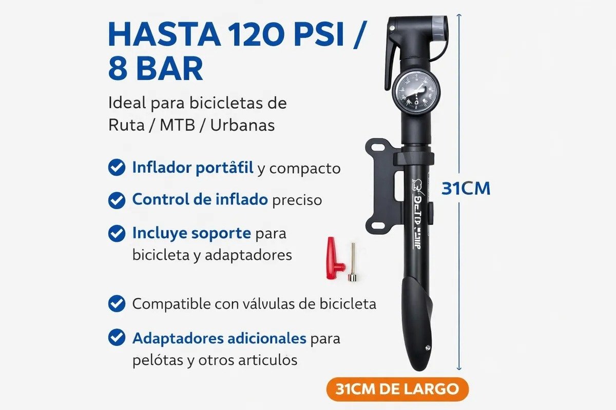 Inflador manual portátil para bicicleta, compacto y práctico, ideal para llevar durante paseos, entrenamientos o viajes. Cuenta con **manómetro incorporado** que permite controlar la presión de inflado de forma precisa en todo momento. Soporta una **presión máxima de hasta 120 PSI (8 BAR)**, siendo apto para bicicletas de **ruta, MTB y urbanas**. Su diseño liviano y resistente facilita un inflado rápido y eficiente. Tiene un **largo total de 31 cm**, lo que lo hace fácil de transportar sin ocupar demasiado espacio. Incluye **soporte para fijación en el cuadro de la bicicleta**, permitiendo llevarlo siempre a mano. Además, incorpora **adaptadores adicionales** para inflar pelotas y otros artÃculos inflables, convirtiéndolo en una herramienta multiuso. Una opción práctica y confiable para ciclistas que buscan portabilidad, control y funcionalidad en un solo producto.