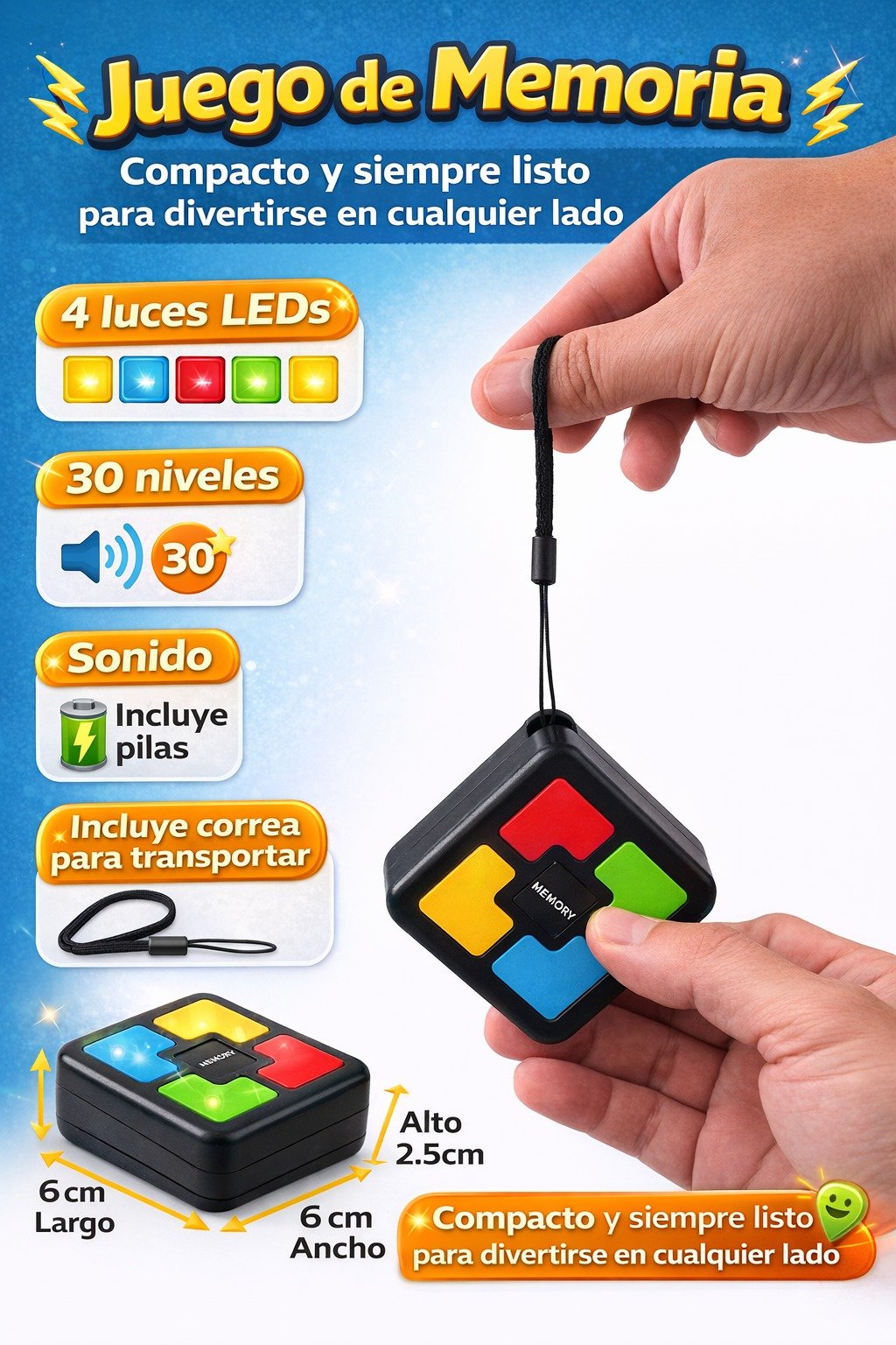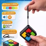 Juego de Memoria Electrónico Divertido, compacto y siempre listo para llevar a cualquier parte. Ideal para estimular la concentración, la memoria y la agilidad mental tanto en niños como en adultos. 4 luces LED de colores 30 niveles de dificultad progresiva Sonido interactivo Incluye pilas Incluye correa para transportar Gracias a su tamaño compacto, es perfecto para mochila, bolso o bolsillo. Ideal para viajes, salidas o entretenimiento en casa. Medidas: • Largo: 6 cm • Ancho: 6 cm • Alto: 2.5 cm Un juego práctico, portátil y siempre listo para divertirse en cualquier lado.