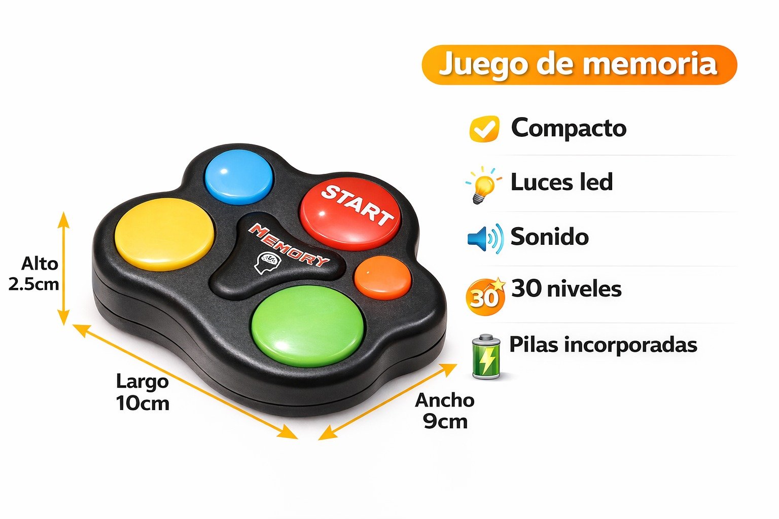 Juego de Memoria Electrónico Divertido y práctico juego de memoria ideal para niños y adultos. Diseñado para estimular la concentración, la agilidad mental y la coordinación mientras se divierten. Compacto y fácil de transportar Luces LED de colores Sonido interactivo 30 niveles progresivos de dificultad Pilas incorporadas Medidas del producto: • Largo: 10 cm • Ancho: 9 cm • Alto: 2.5 cm Su tamaño compacto lo hace ideal para llevar en mochila, bolso o usar en casa. Perfecto para desarrollar la memoria y pasar momentos entretenidos en familia.