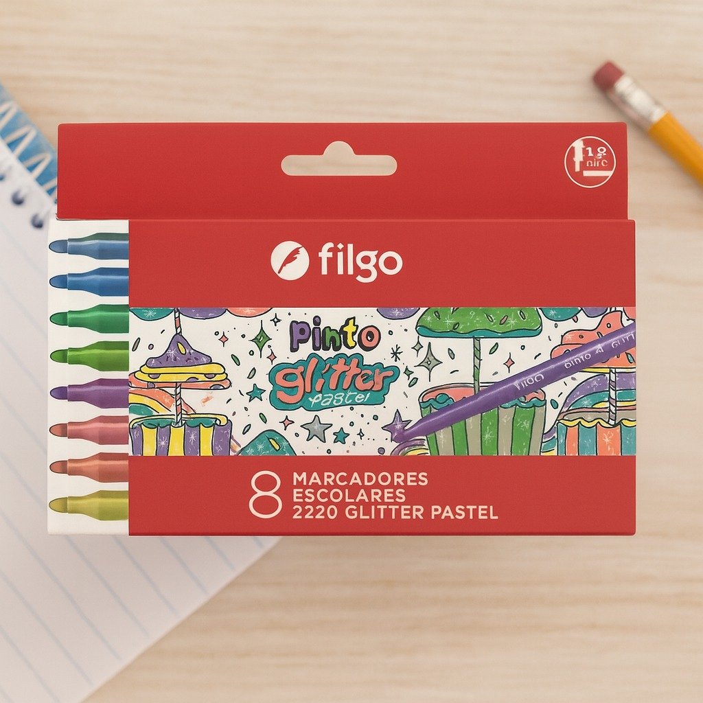 Set de marcadores escolares **Filgo Pinto Glitter Pastel**, ideal para uso escolar, artístico y creativo. Incluye **8 marcadores** en delicados colores pastel con **efecto glitter**, que aportan brillo suave y atractivo a dibujos, apuntes y trabajos manuales.
