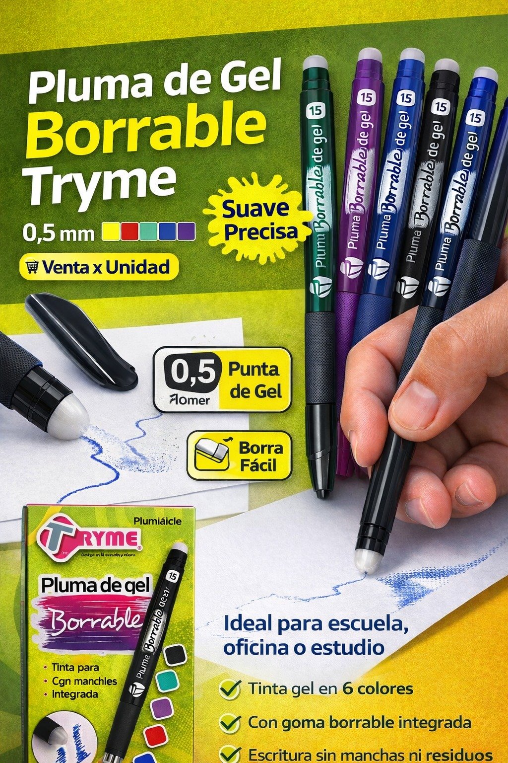Pluma de gel color NEGRO borrable Tryme diseñada para escritura suave, precisa y cómoda. Su tinta de gel permite un trazo fluido, ideal para uso escolar, de oficina o estudio. Gracias a su sistema borrable con goma integrada, es posible corregir sin dañar el papel ni dejar residuos.